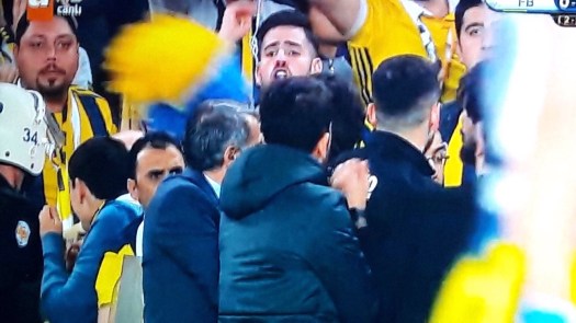 Gerilim düzeyi yüksek böyle bir maçta kulübenin içinde oturması gerekirken, ayakta maçı izlemeyi tercih etmesi, hemen arkasındaki taraftarla yaşanması zaten muhtemel sürtüşmenin fitilini ateşleyen bir hareketti.