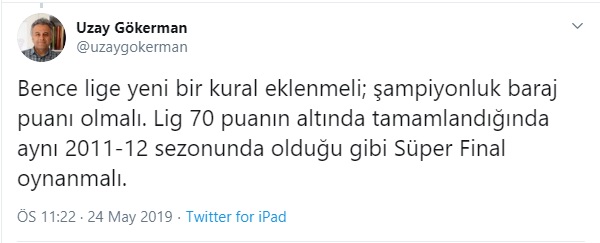 Bu öneriyi 2018-19 sezonunun şampiyonluk puanın 69’da kalmasından sonra yapmıştım. Galatasaraylılar tepki gösterdiler, dönemsel olarak böyle çıkışlar olabilir ancak bu sezon bunun 69’un da altına inme ihtimali var ki bence adil bir sonuç olmayacaktır, her kim kazanırsa kazansın.