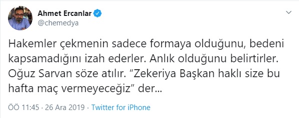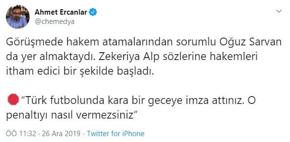 Dün öğle saatlerinde Twitter’da Ahmet Ercanlar bir seri tweet attı. Yazdıklarının konusu Fenerbahçe-Beşiktaş maçı üzerinden yürütülen pozisyonlara MHK Başkanı Zekeriye Alp’in müdahil olup hem hakemi hem VAR hakemini çağırarak acil toplantı yapılmasının detaylarıydı.