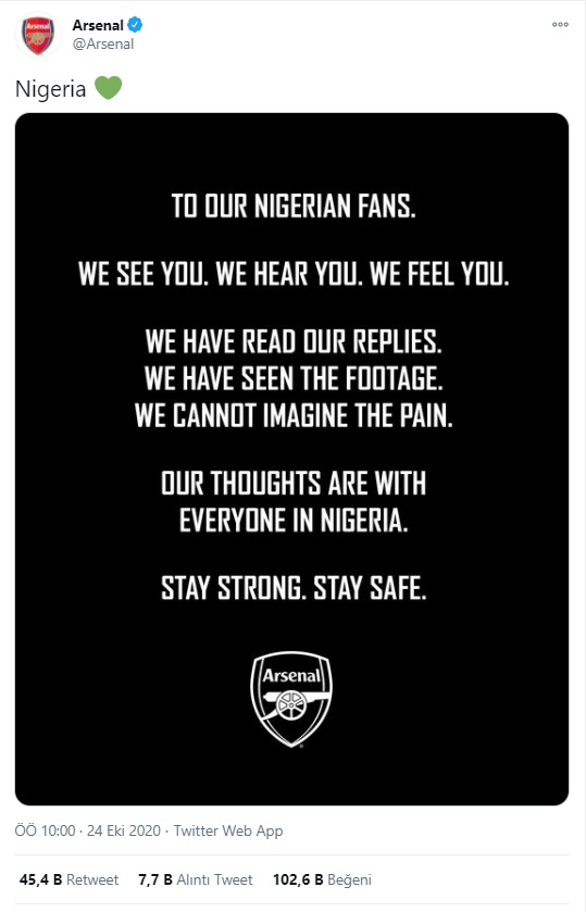 Öyle olsaydı Arsenal, 24 Ekim 2020 tarihinde Nijerya’daki olaylar nedeniyle oradaki sempatizanlarına bir destek tweeti atmazdı.