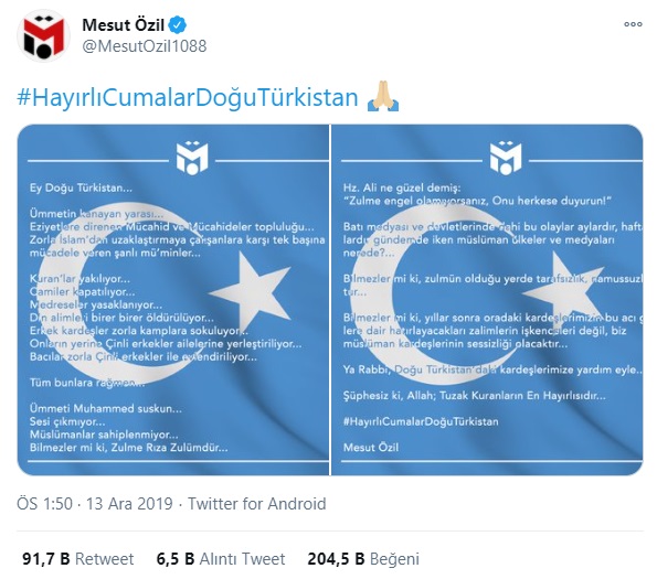 Mesut Özil, 13 Aralık 2019 günü sosyal medya hesaplarından Doğu Türkistan paylaşımı yaptı.