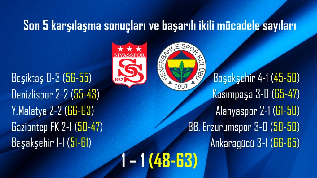 Aşağıdaki veriler Fenerbahçe’nin ve rakiplerinin maçlarında ikili mücadelelerden başarıyla çıkma sayılarını gösteriyor. Sivasspor maçı dahil son 6 karşılaşmadaki ortalamalarla öncelikler arasında büyük fark var.