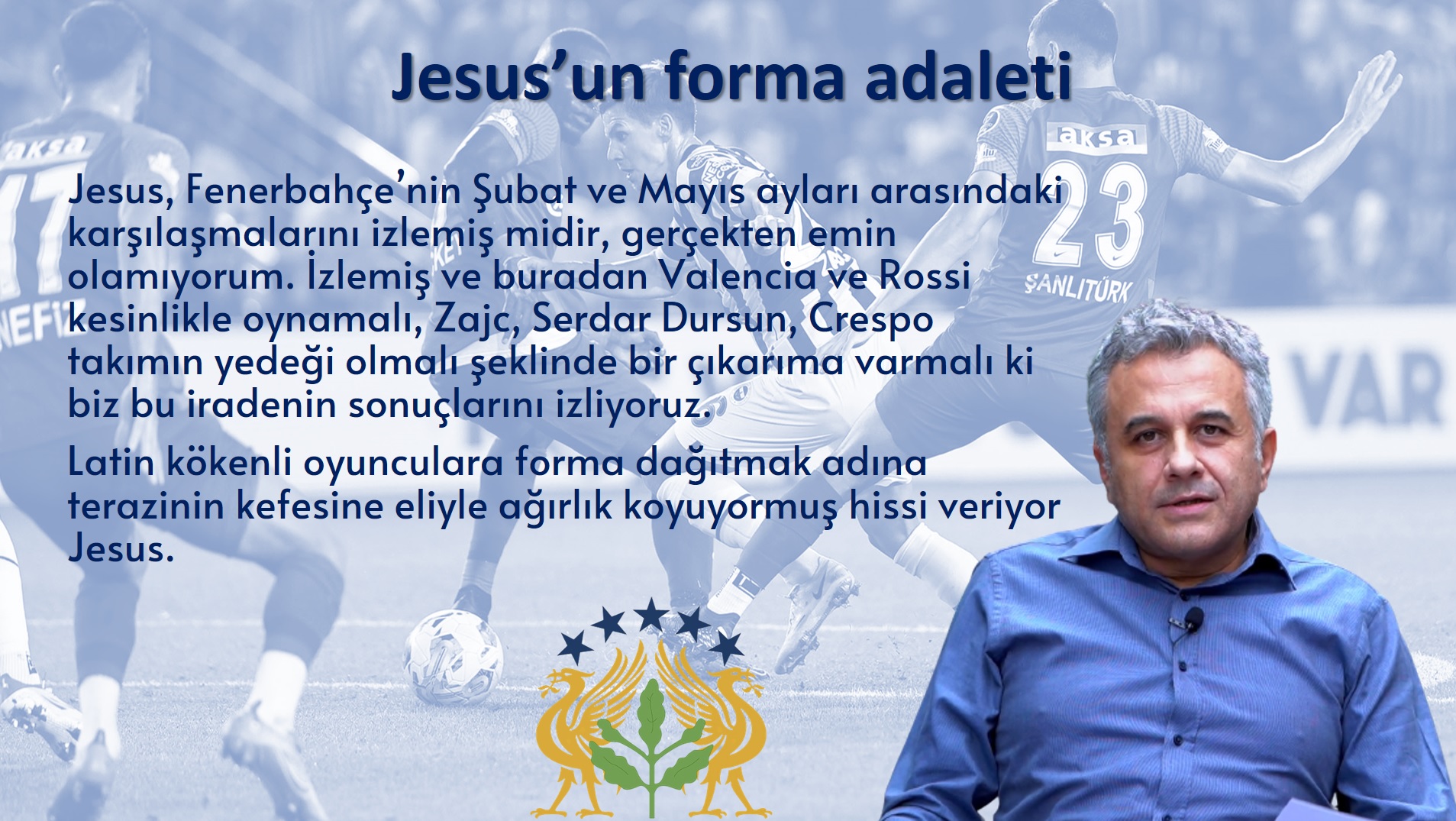 Jesus, Fenerbahçe’nin Şubat ve Mayıs ayları arasındaki karşılaşmalarını izlemiş midir, gerçekten emin olamıyorum. İzlemiş ve buradan Valencia ve Rossi kesinlikle oynamalı, Zajc, Serdar Dursun, Crespo takımın yedeği olmalı şeklinde bir çıkarıma varmalı ki biz bu iradenin sonuçlarını izliyoruz.