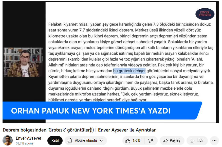 Orhan Pamuk bir yazar refleksi ile deprem felaketinin yarattığı enkazı söylemesi oldukça fiyakalı bir kelime ile anlatmaya çalışıyor. The New York Times okuru acaba bunu dert ediniyor mu, ayırt edebiliyor mu bilmiyorum ancak Enver Aysever tam da Fethi Naci titizliği ile duruma müdahale ediyor.