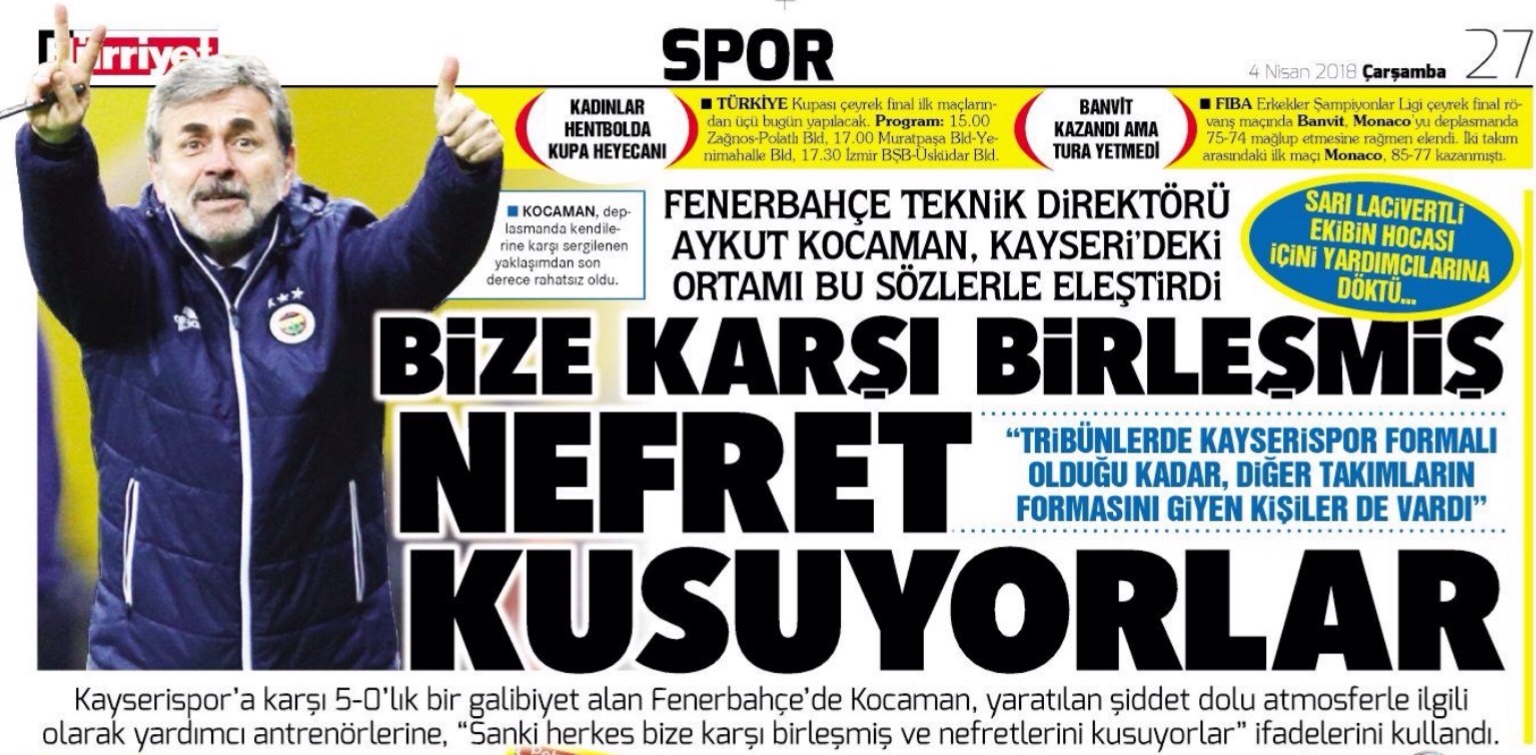 Fenerbahçe-Osmanlıspor maçını 2-0 kazandı ancak özellikle spor medyası bu karşılaşmayı Aykut Kocaman’a karşı kazanılmış bir zafer olarak değerlendirmeyi uygun gördü. Neydi bu zafer? İlk yarı kötü futbol oynayan Fenerbahçe’de ikinci devre spor medyasının Aykut Kocaman’a karşı argüman olarak kullandığı Valbuena girererek sorunu çözdü. Haftalardır Fenerbahçe’de Valbuena’nın oynaması gerektiğini iddia edenler karşılaşma sırasında ve sonrasındaki yorumlarında; …